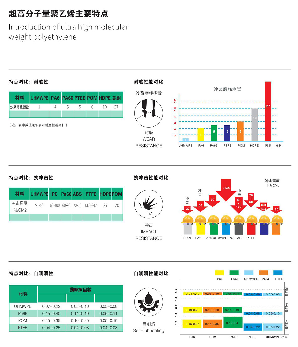 1)耐磨性極高,比尼龍66和聚四氟乙烯高4倍,比碳鋼高6倍,是目前所有合成樹脂中最好的。